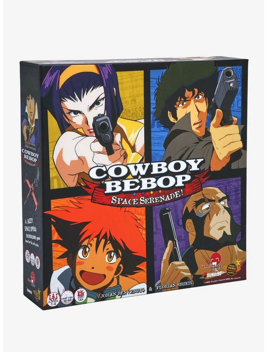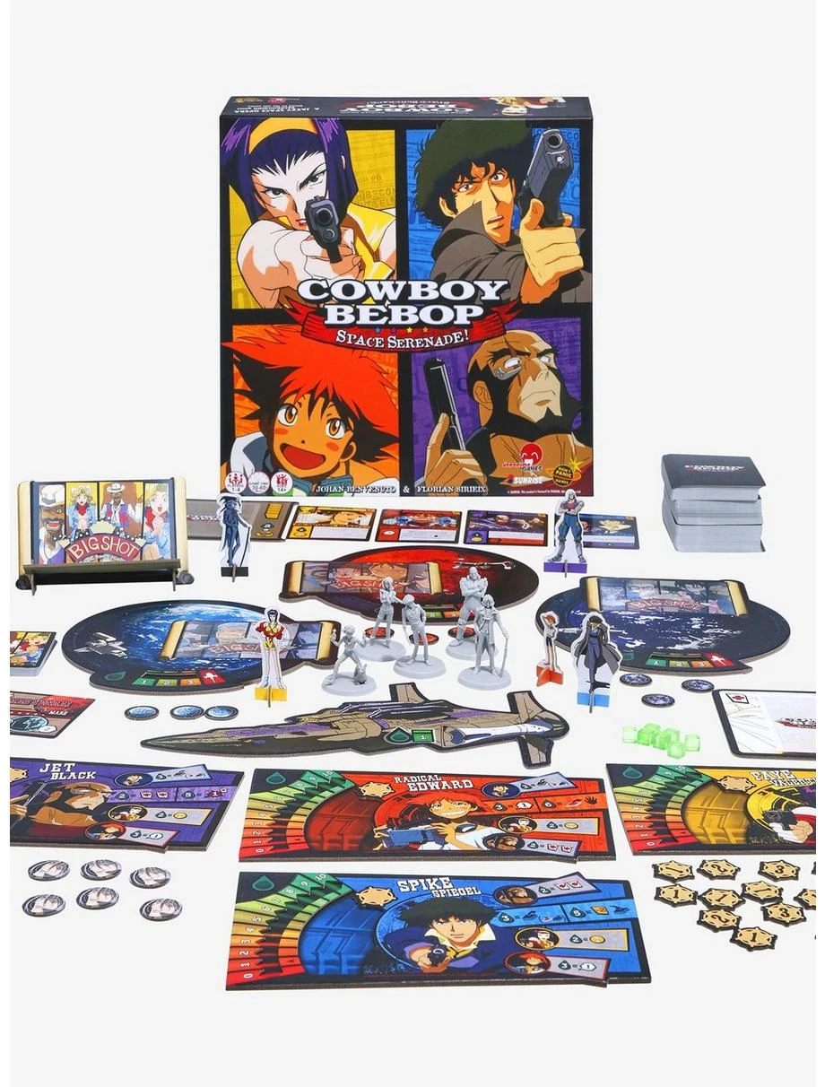 Society has taken to space and has spread across the solar system so the government now must rely on bounty hunters to try to enforce the law in Cowboy Bebop Space Serenade! The Game! Play as Spike, Faye, Jet, or Ed and Ein to hunt criminals and go head-to-head against the sinister Vicious, in this action-packed, jazzy deck-building game!